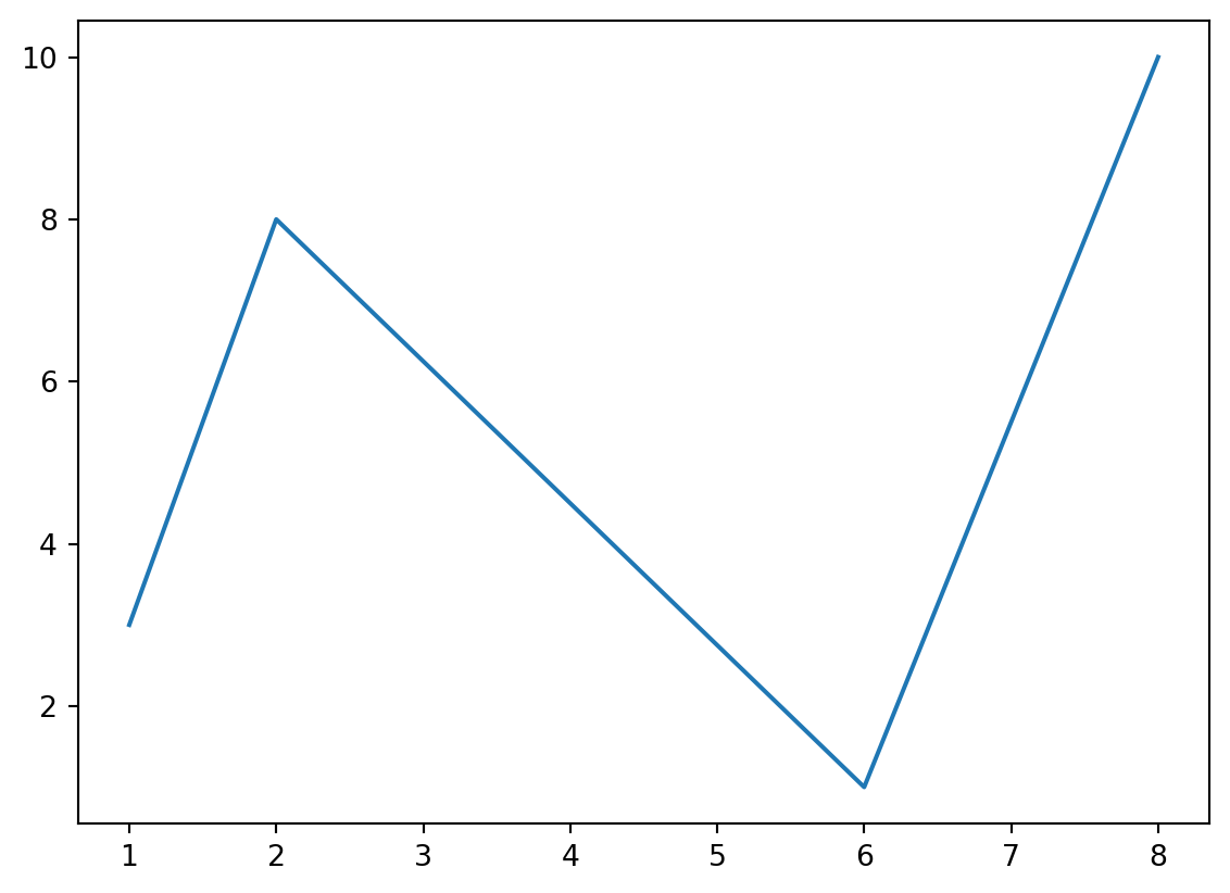 If we need to plot a line from (1, 3) to (8, 10), we have to pass two arrays [1, 8] and [3, 10] to the plot function.